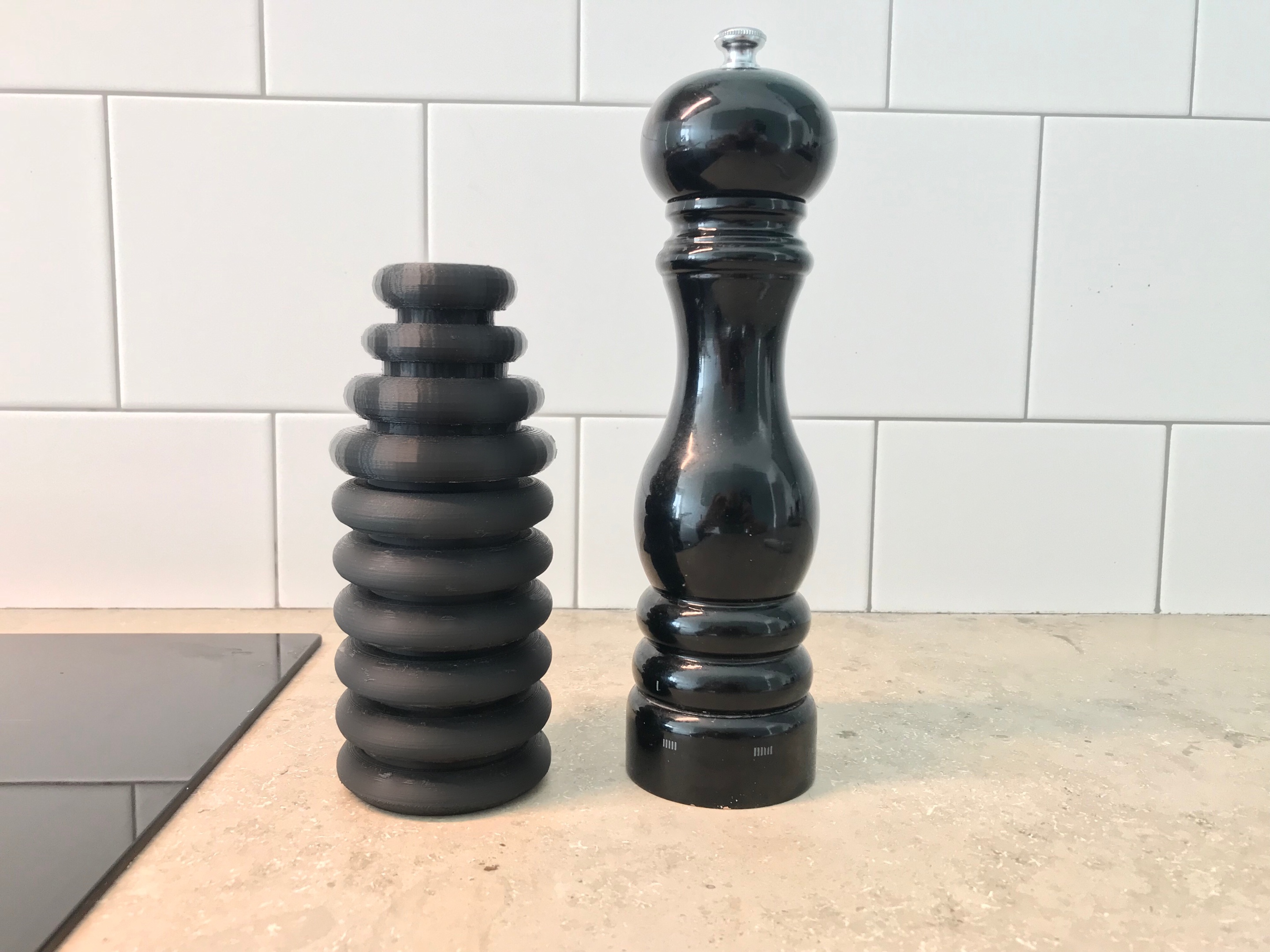 Turned painted wood. The prototype in 3D printed plastic.